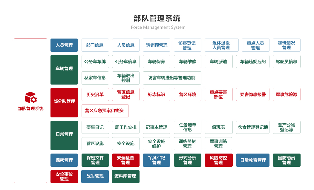 部隊(duì)管理系統(tǒng)基于對(duì)營(yíng)區(qū)內(nèi)人、車、dy、崗哨等建設(shè)要求,結(jié)合軍隊(duì)自身特點(diǎn)及應(yīng)用現(xiàn)狀,實(shí)現(xiàn)網(wǎng)絡(luò)化管理,提高人、車等管理的效率。可以提高響應(yīng)能力,構(gòu)建人、車、q、d、密的全方位綜合管理的部隊(duì)系統(tǒng),保障整體系統(tǒng)高效、穩(wěn)定、安全運(yùn)行,提升部隊(duì)全面信息化建設(shè)層次